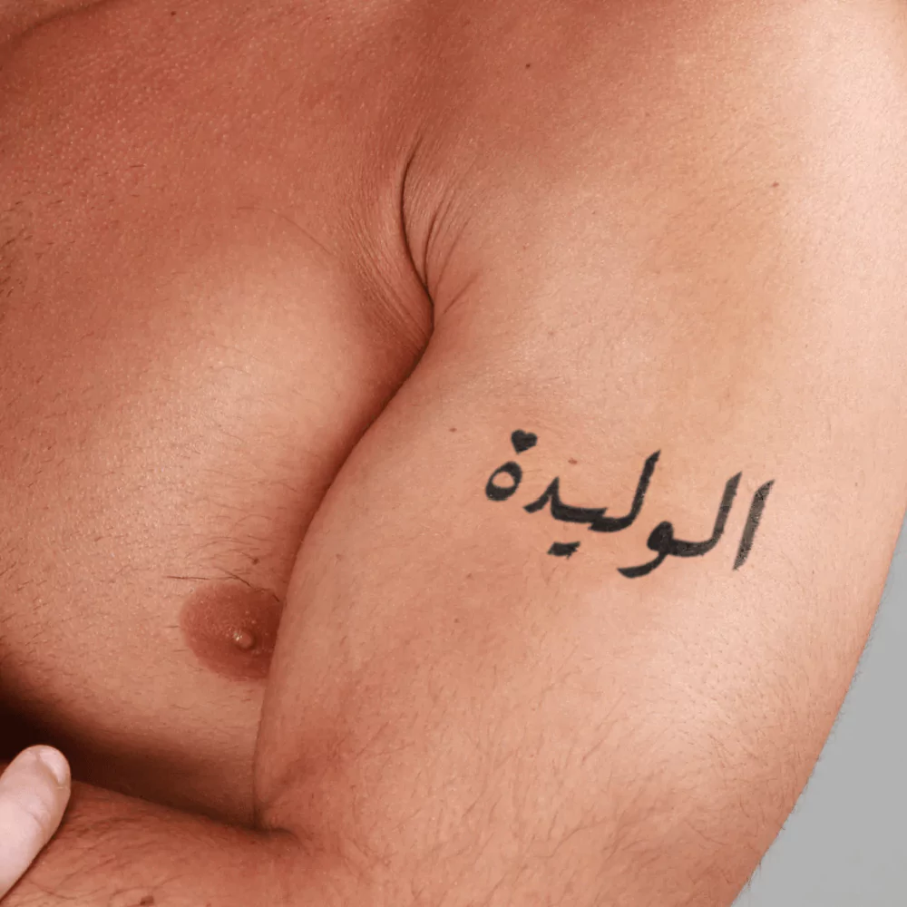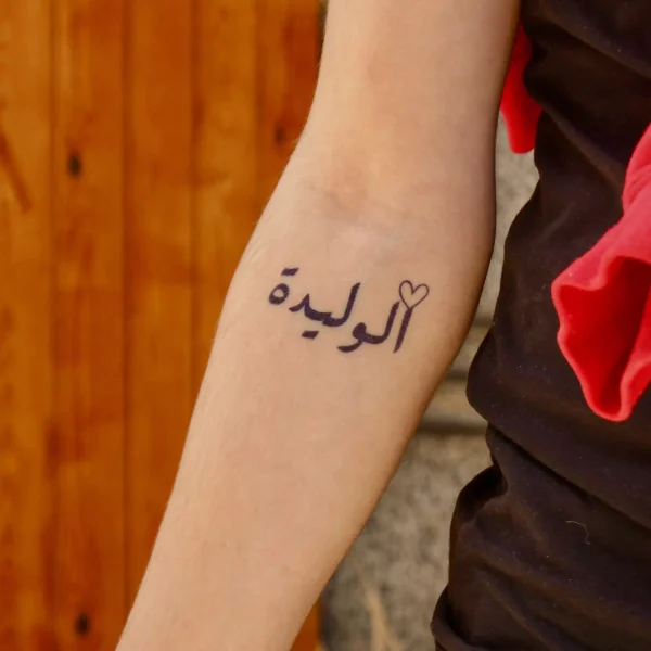 Ce tatouage semi-permanent rend un hommage touchant à celle qui nous a donné la vie. « الوليدة » symbolise l’amour inconditionnel, la protection et la gratitude envers la mère, pilier de notre existence et source infinie de tendresse.