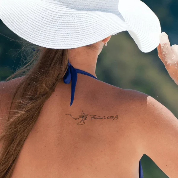 Deviens un Papillon. L’appel à la transformation. Ce tatouage semi-permanent inspirant symbolise la croissance personnelle, la métamorphose et la liberté de devenir la meilleure version de soi-même. Envolez-vous vers votre plein potentiel.