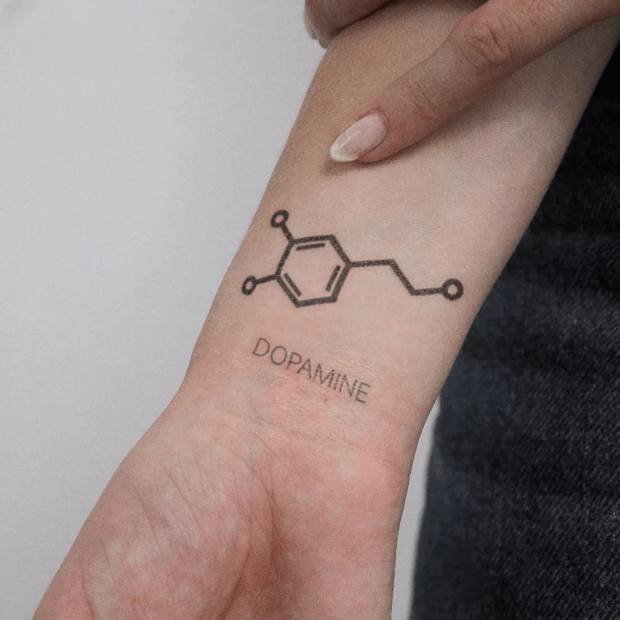 Exprimez votre passion pour la science et les émotions avec ce tattoo semi-permanent représentant la molécule de dopamine, le neurotransmetteur du plaisir et de la motivation. Son design minimaliste et élégant en fait un symbole puissant de joie, d’accomplissement et d’énergie positive.